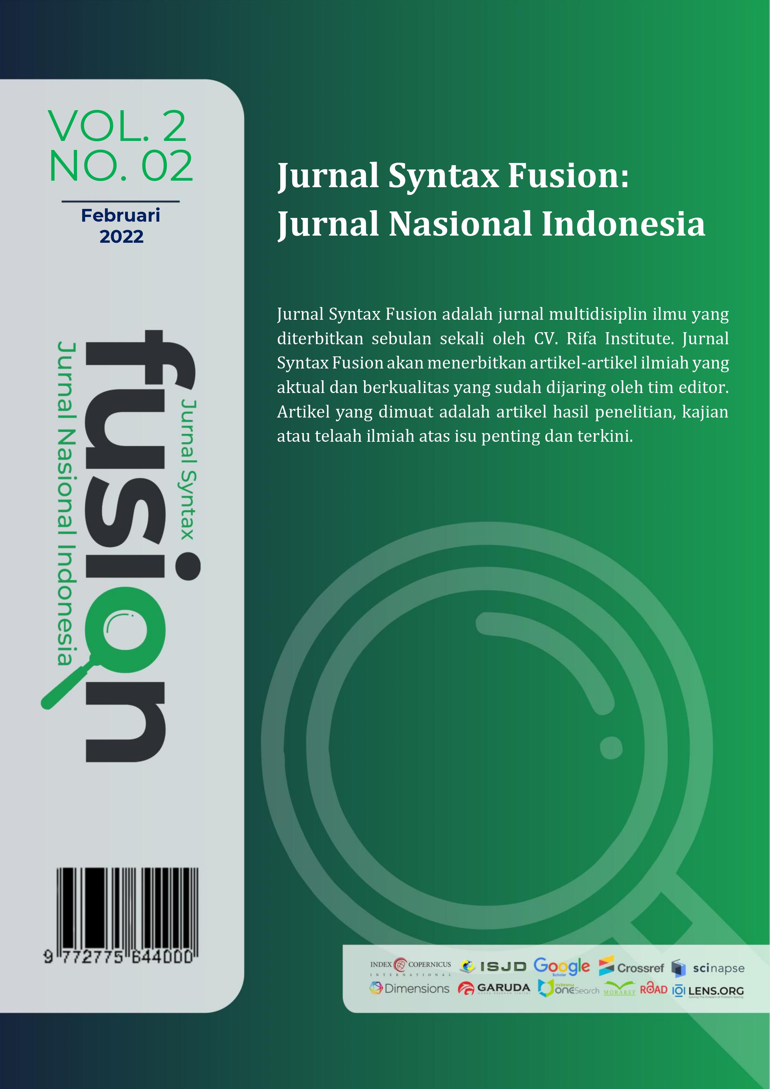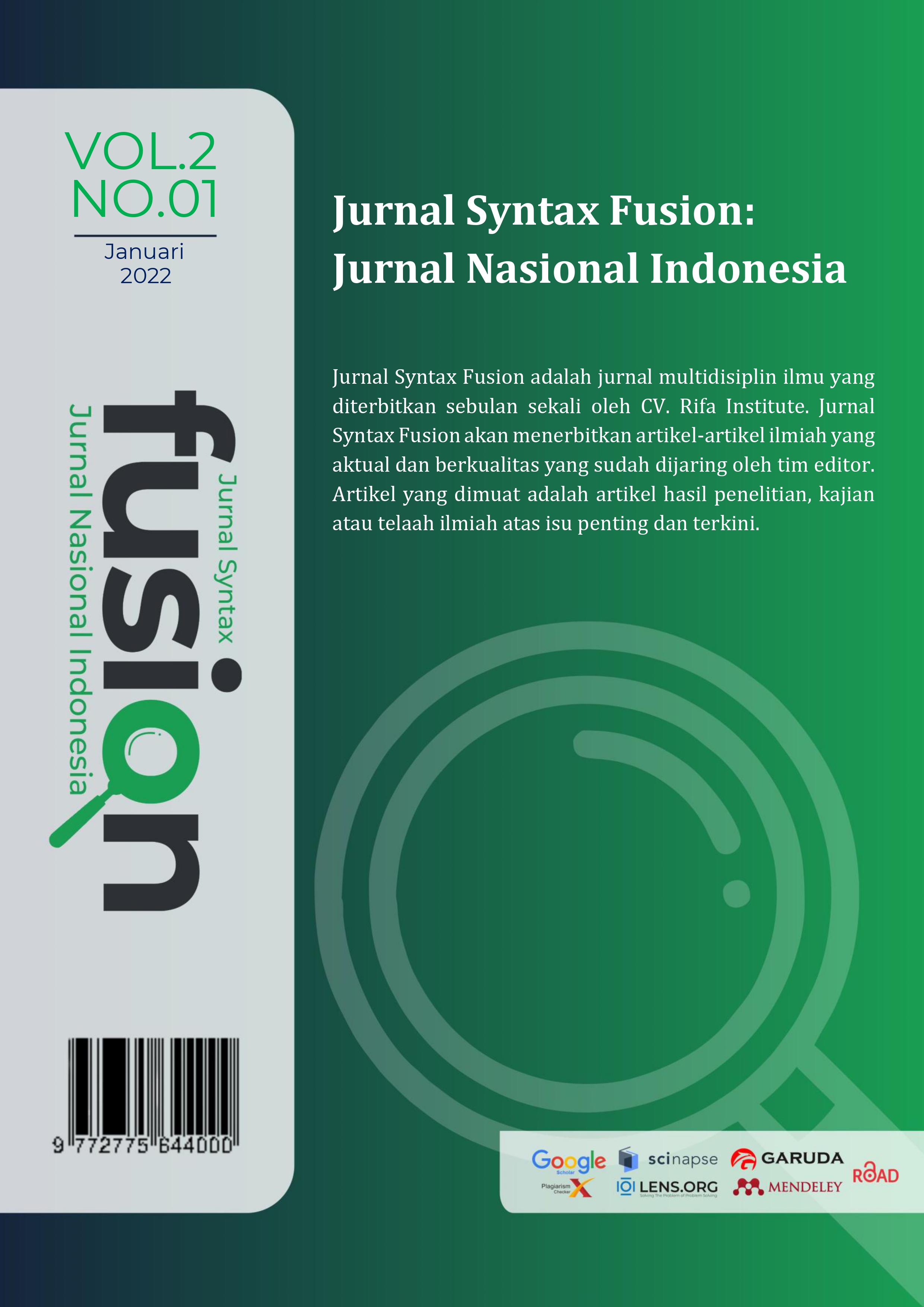 Vol. 2 No. 11 (2022)Jurnal Syntax Fusion adalah jurnal multidisiplin ilmu yang diterbitkan sebulan sekali oleh CV. Rifa Institute. Jurnal Syntax Fusion akan menerbitkan artikel-artikel ilmiah yang aktual dan berkualitas yang sudah dijaring oleh tim editor. Artikel yang dimuat adalah artikel hasil penelitian, kajian atau telaah ilmiah atas isu penting dan terkini.